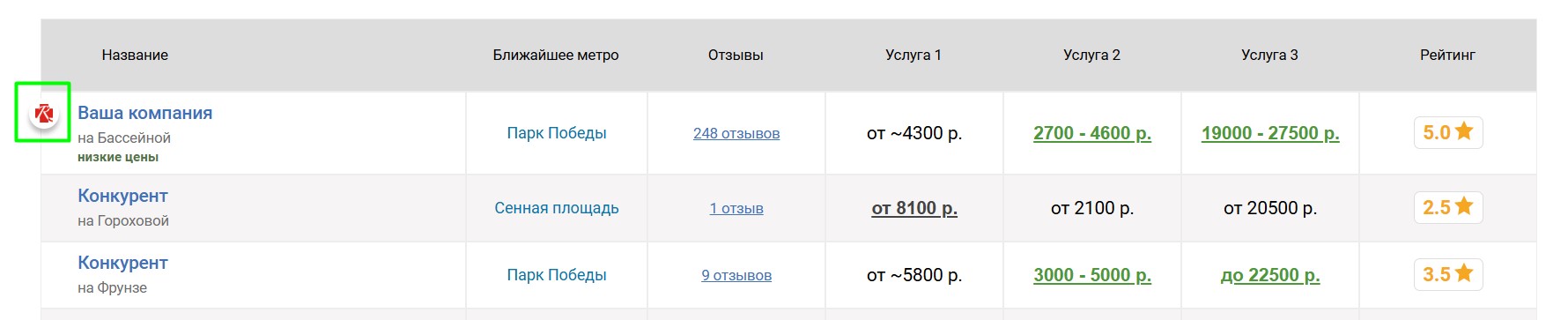Иконка 16х16 пикселей будет отображаться слева от названия вашего ателье в таблицах, выделяя его среди прочих. Опция увеличивает вероятность перехода на страницу компании и рекомендуется в качестве дополнения к прочим методам продвижения, в первую очередь для ателье с узнаваемым брендом.